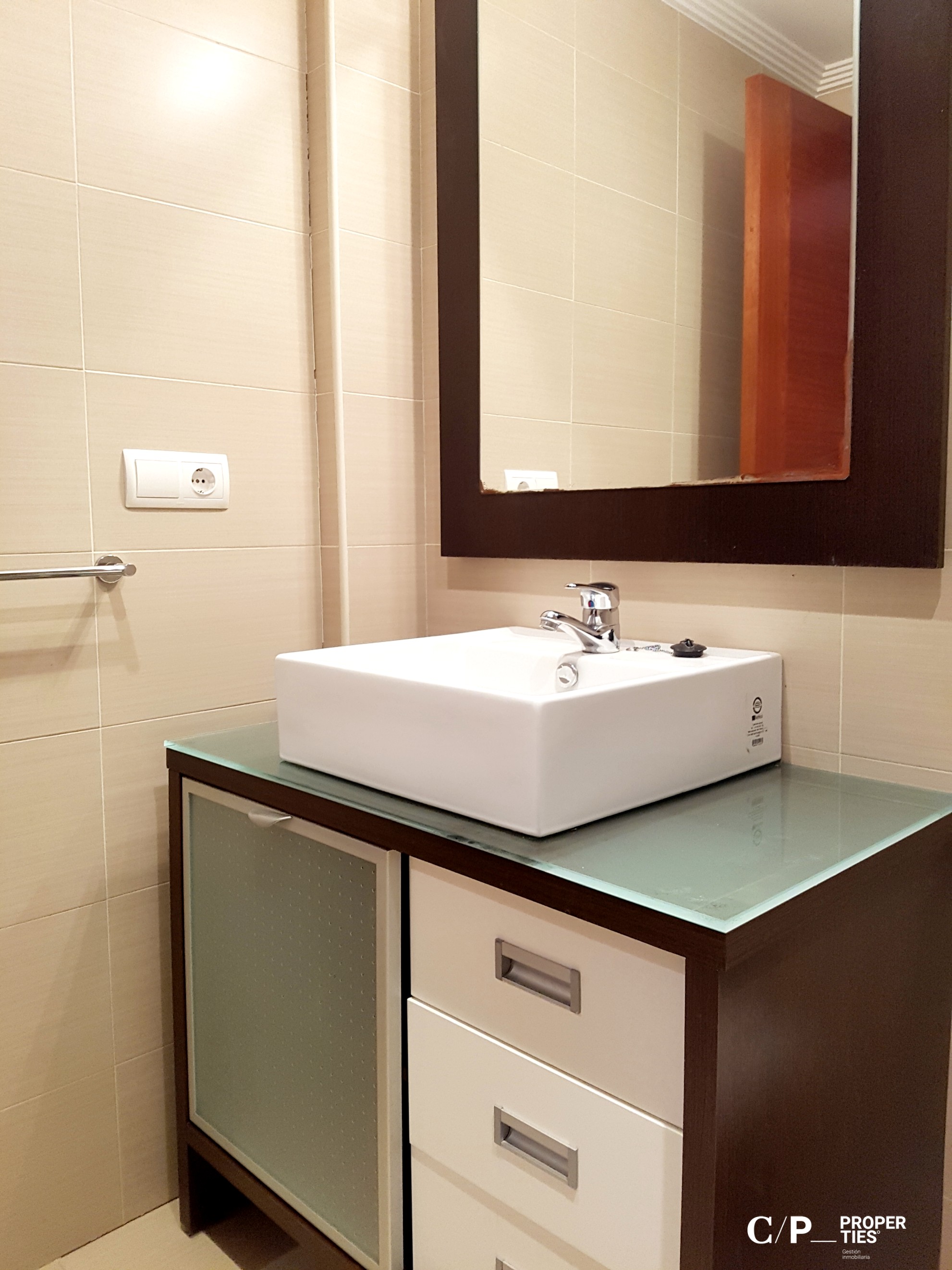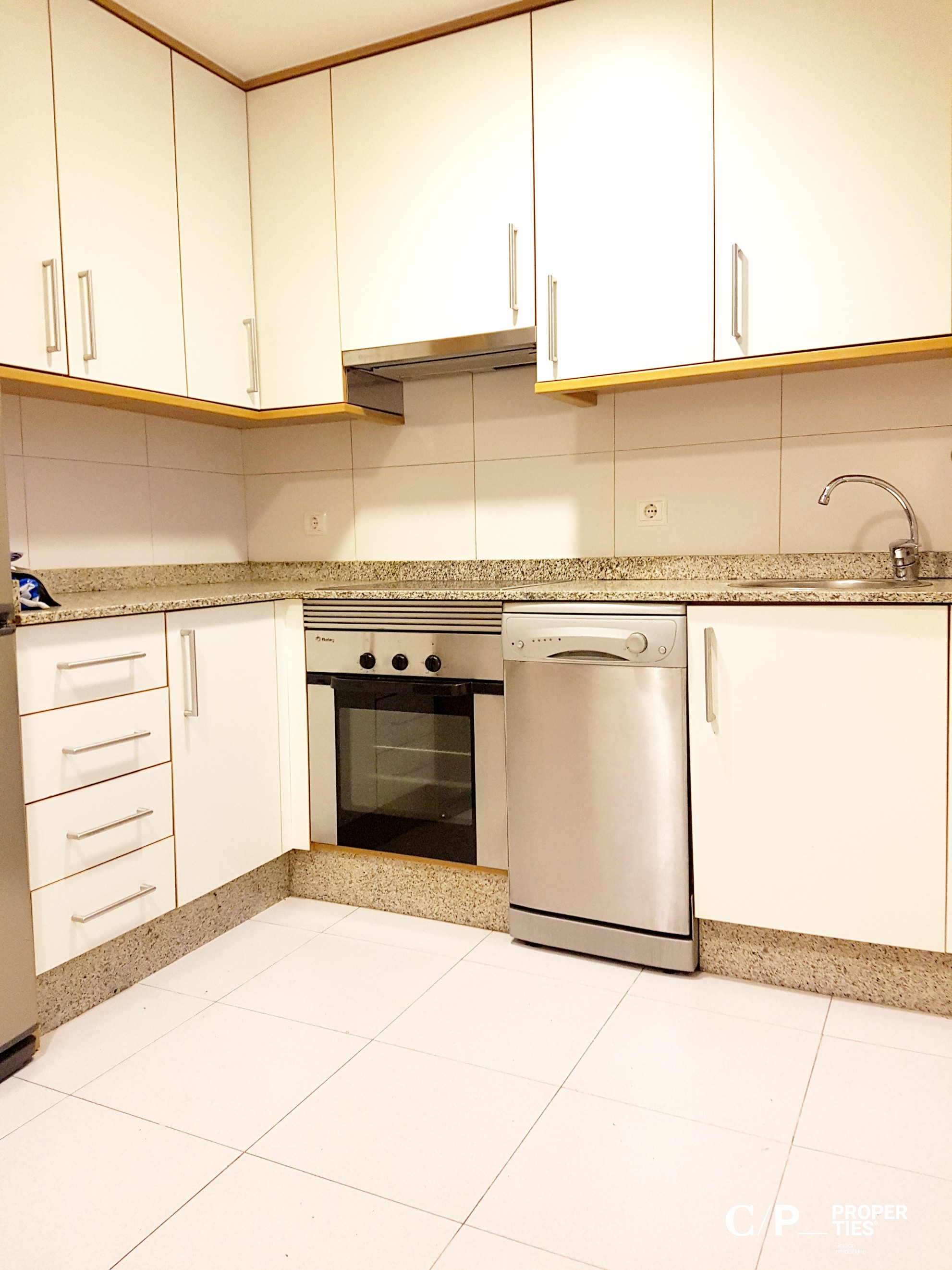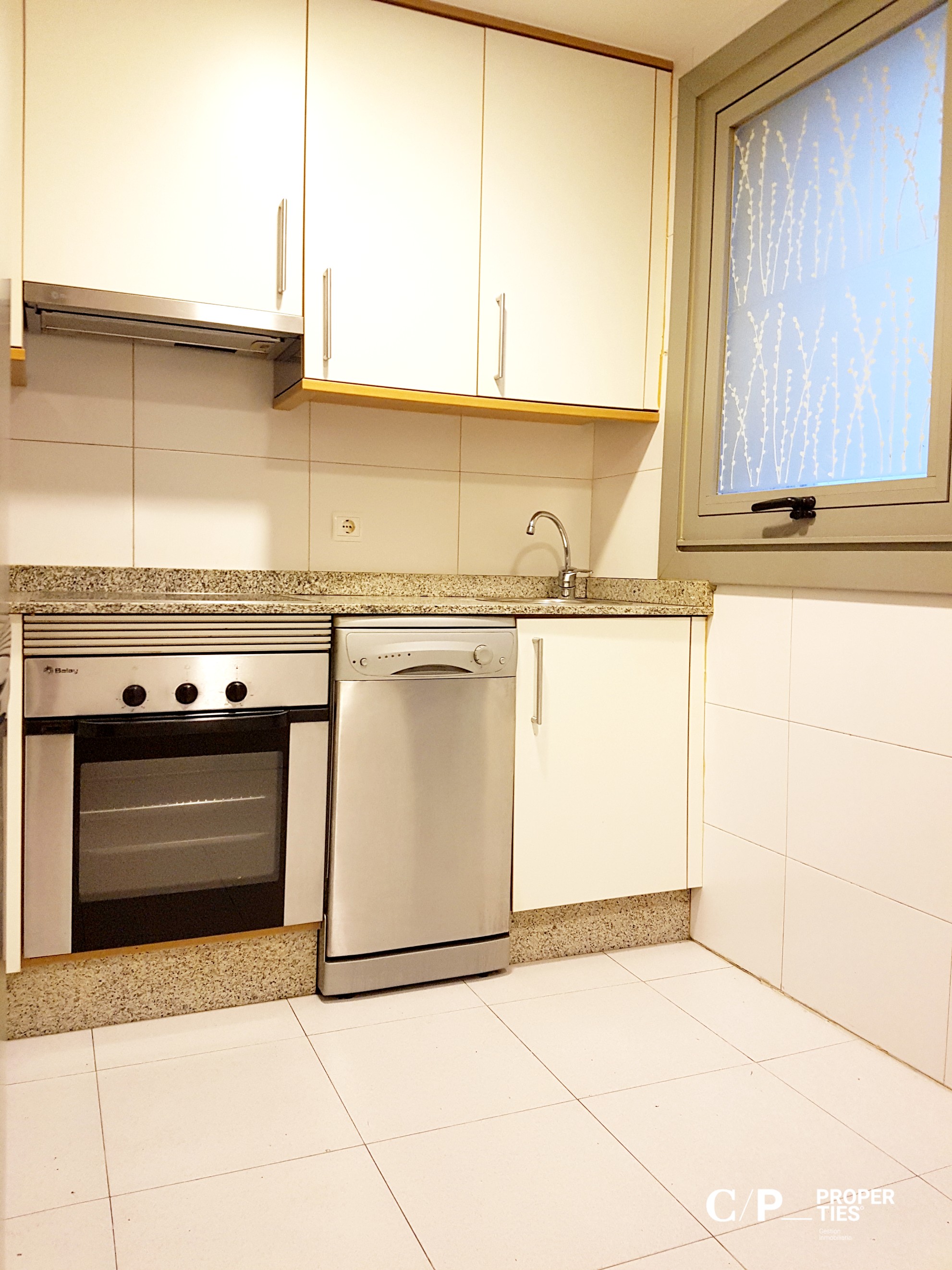 Dispone de unos 84 m2 distribuidos en: un hall recibidor; un salón comedor amplio con ventanal grande al exterior; una cocina totalmente amueblada y equipada con electrodomésticos incluidos lavadora (situada en el cuarto lavadero) y un lavavajillas; dos dormitorios independientes con armarios empotrados, y dos cuartos de baño completos.