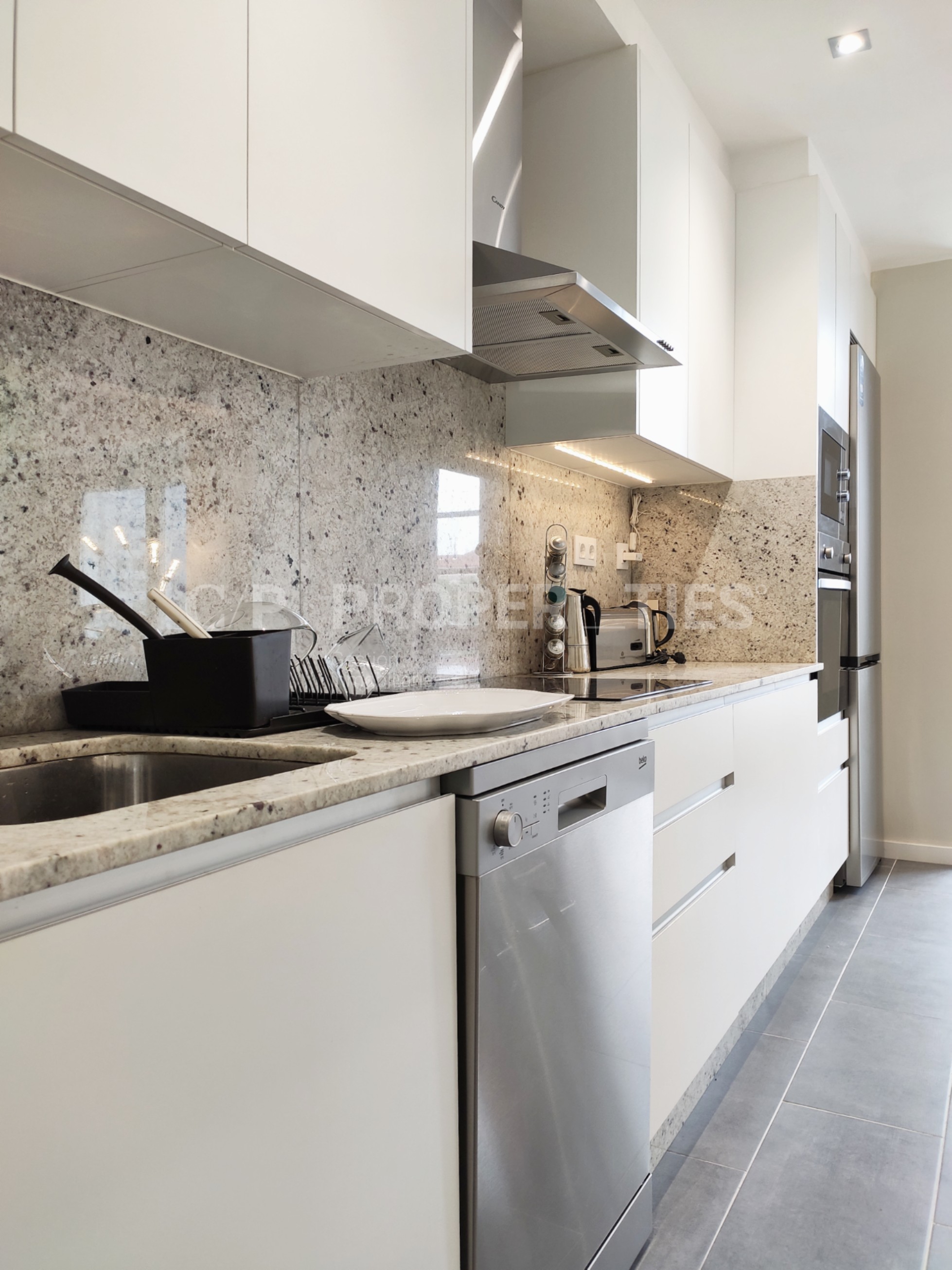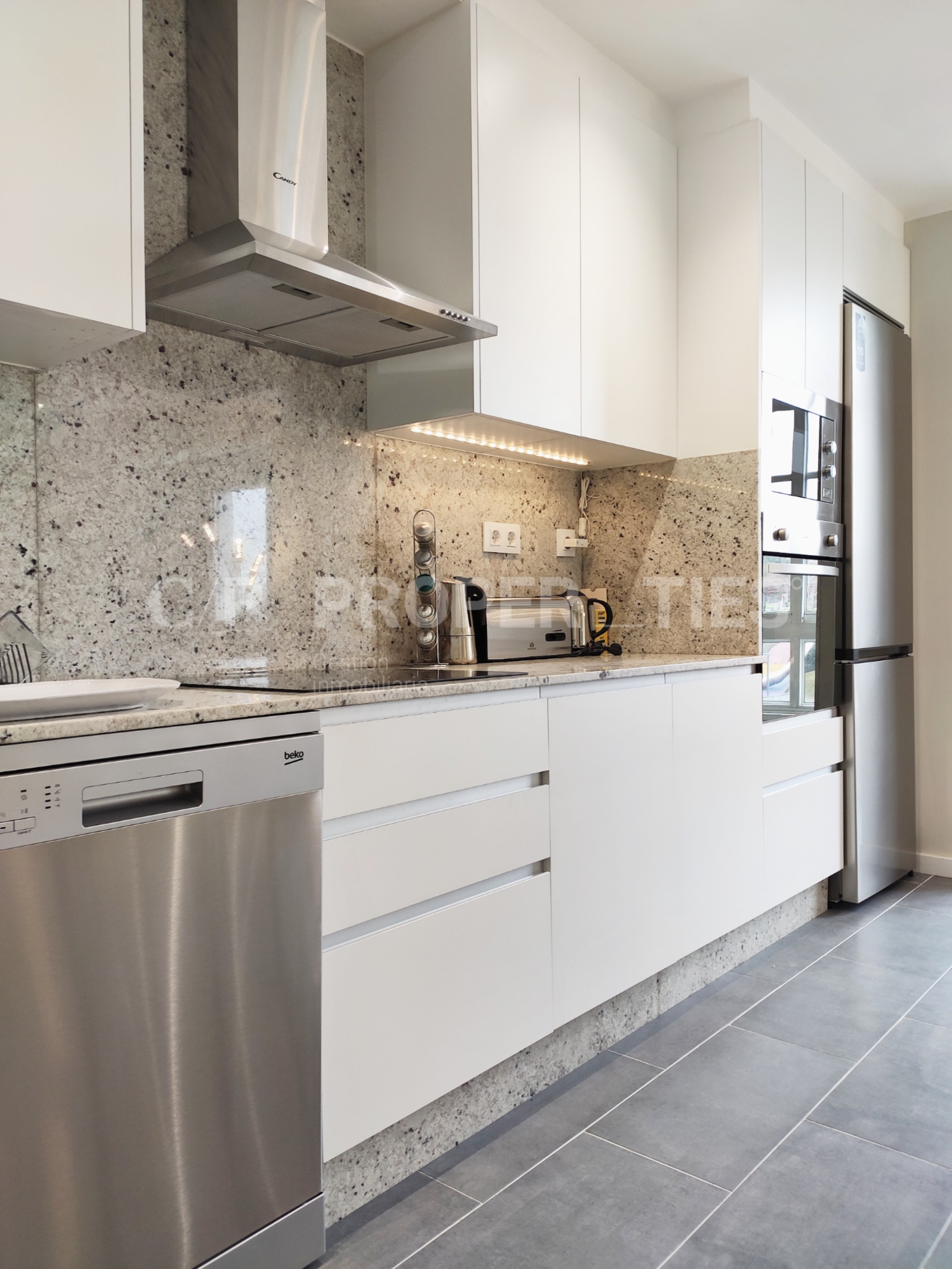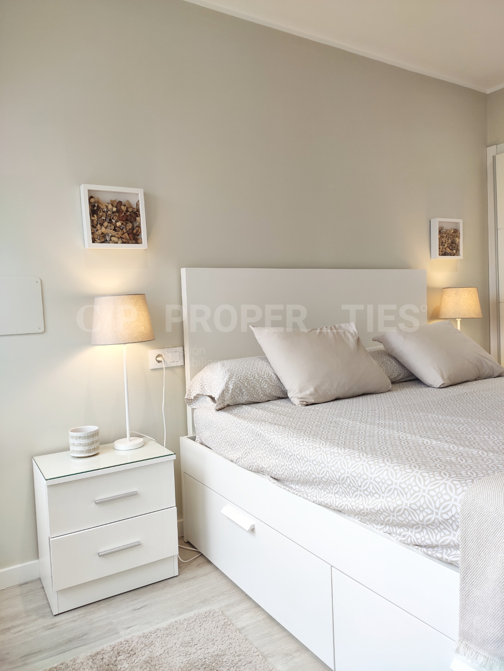 El diseño interior destaca por su elegancia en tonos neutros, creando un ambiente acogedor y sofisticado. La sala de estar se conecta con el salón principal, formando un espacio amplio ideal para disfrutar en familia o con amigos. La cocina, completamente equipada con electrodomésticos de alta calidad, se integra al salón comedor, facilitando la interacción mientras cocinas tus platos favoritos. La vivienda cuenta con cuatro dormitorios independientes, cada uno con armarios empotrados, y dos baños completos equipados con platos de ducha.